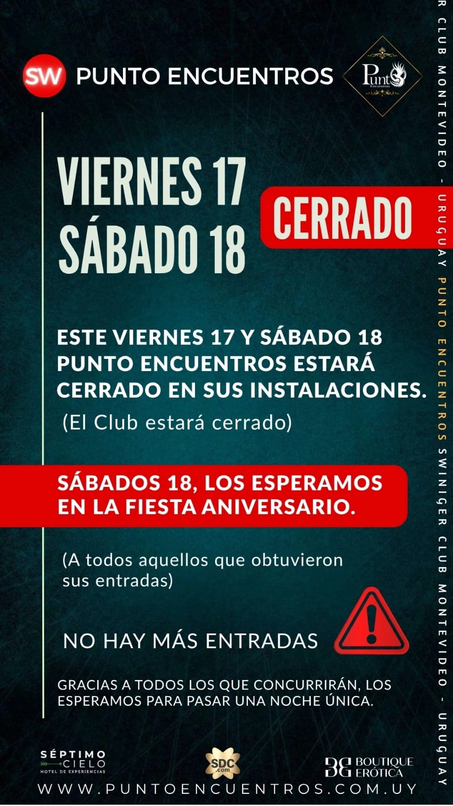 | 📅 Viernes 05 - Viernes Noche donde nos encontramos todos.😉 Le damos la bienvenida a diciembre, cerramos el año !!Noche donde nos encontramos todos, chicas, parejas y terceros.🌙 Noche para que te atrevas a vivir la experiencia Punto Encuentros🖤Vengan a explorar tus fantasías! 😉 | 1764975600 11:00 PM - 4:00 AM |