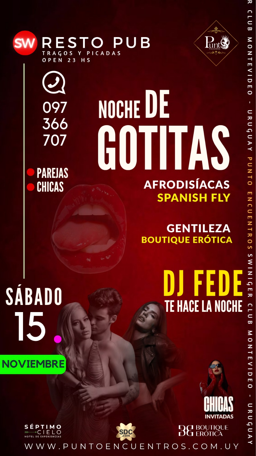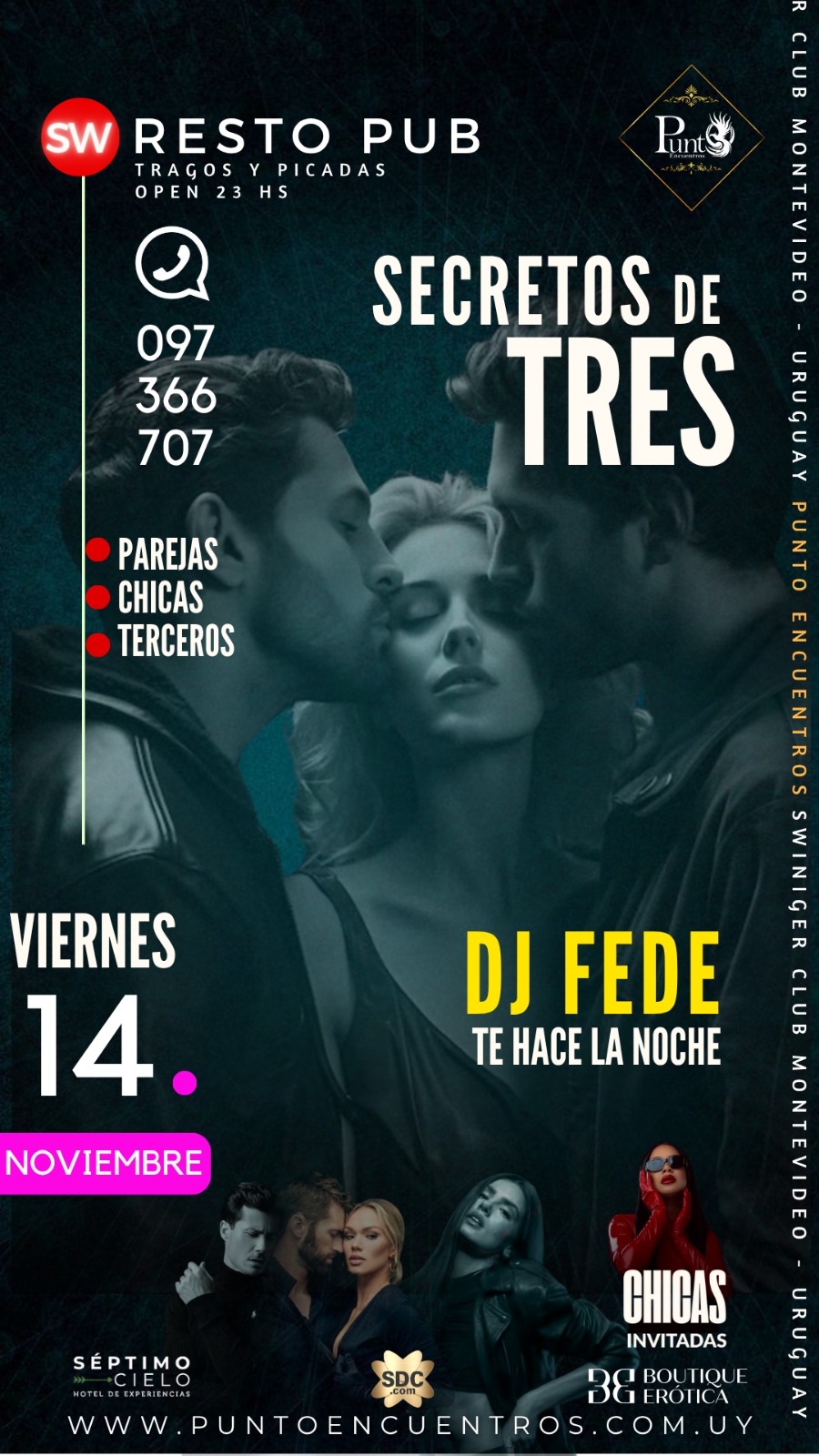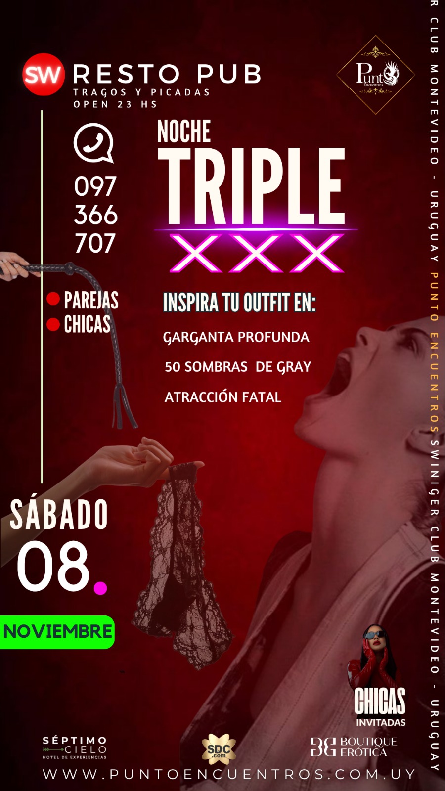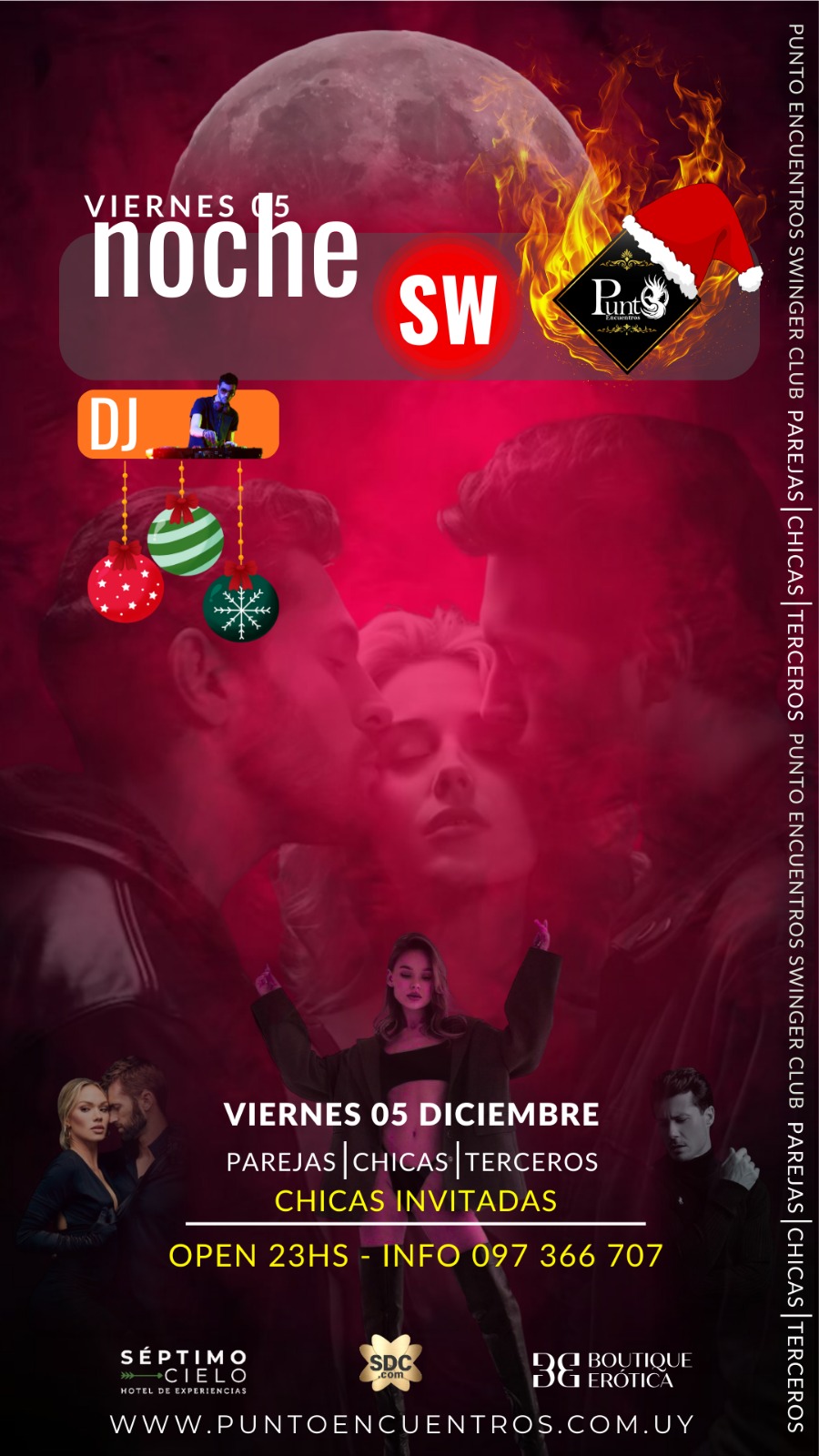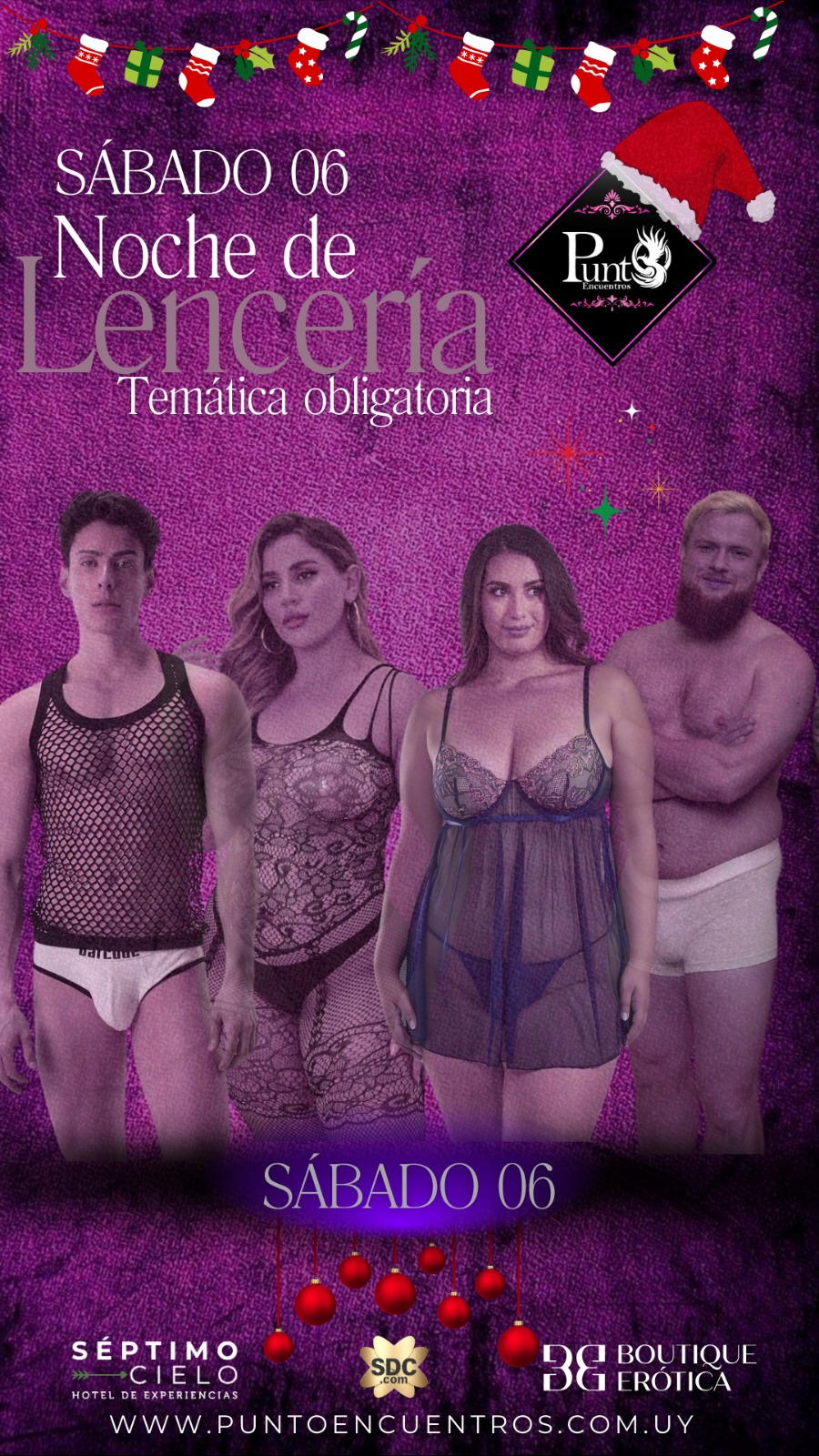 | 📅 Sábado 06 - 🔥 LE DAMOS LA BIENVENIDA A DICIEMBRE 😉😈 Con la noche más sexy y caliente del año, noche de LENCERÍA.(TEMÁTICA OBLIGATORIA) Punto Encuentros los invita a la🎽🩲👞 NOCHE DE LENCERÍA 🩱👙👠AMBIENTE CLIMATIZADO 💯%La única noche temática OBLIGATORIA del año. HOMBRES 🎽🩲👞 •MUSCULOSA•Boxer•Calzado(La remera remangada, no es Musculosa). Mujeres 🩱👙👠•body•encaje•triquini•lencería•babydoll•catsuit•transparencia•calzado🗣️Todas las parejas a su ingreso al club, se les brindara un lugar para poder cambiarse.Los esperamos a todos😈😇, para compartir esta temática🔥, que viene realizándose hace 14 años 🫂 siendo una de las temáticas más sensuales del año💃🏻🕺🏼, para vivir la noche mas 🔥 HOT 🔥dePunto Encuentros | 1765062000 11:00 PM - 5:00 AM |